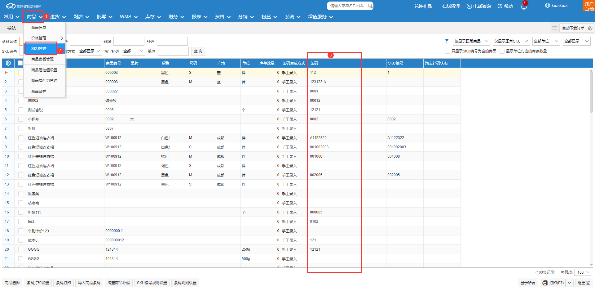 首先:需要在【商品】-【SKU管理】页面,完善软件内商品的条码信息。