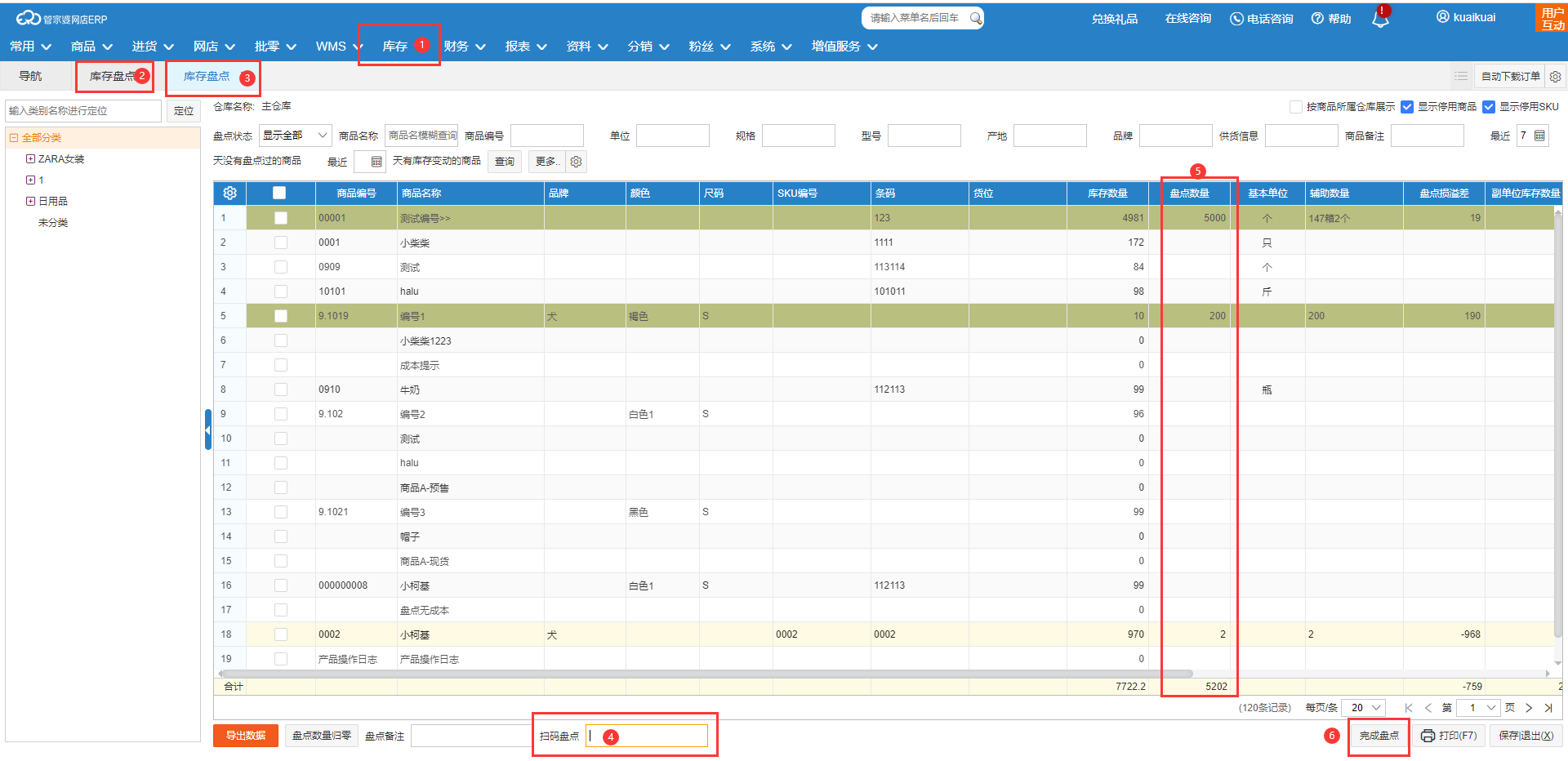 最后:在盘点页面下方,定位到【扫码盘点】,便可扫码商品条码进行盘点。扫码完成后,点击【完成盘点】并且选择【保存过账】后,盘点商品库存变化。