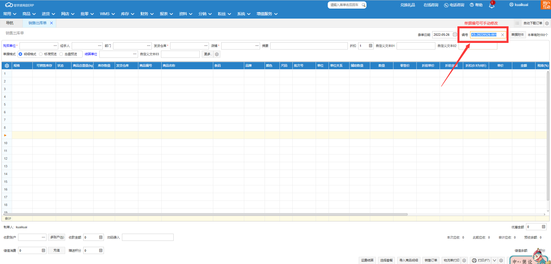 您好,除零售单功能外,其它所有单据类型都可以在单据保存过账之前,可以在单据页面右上角手工修改单据编号。
