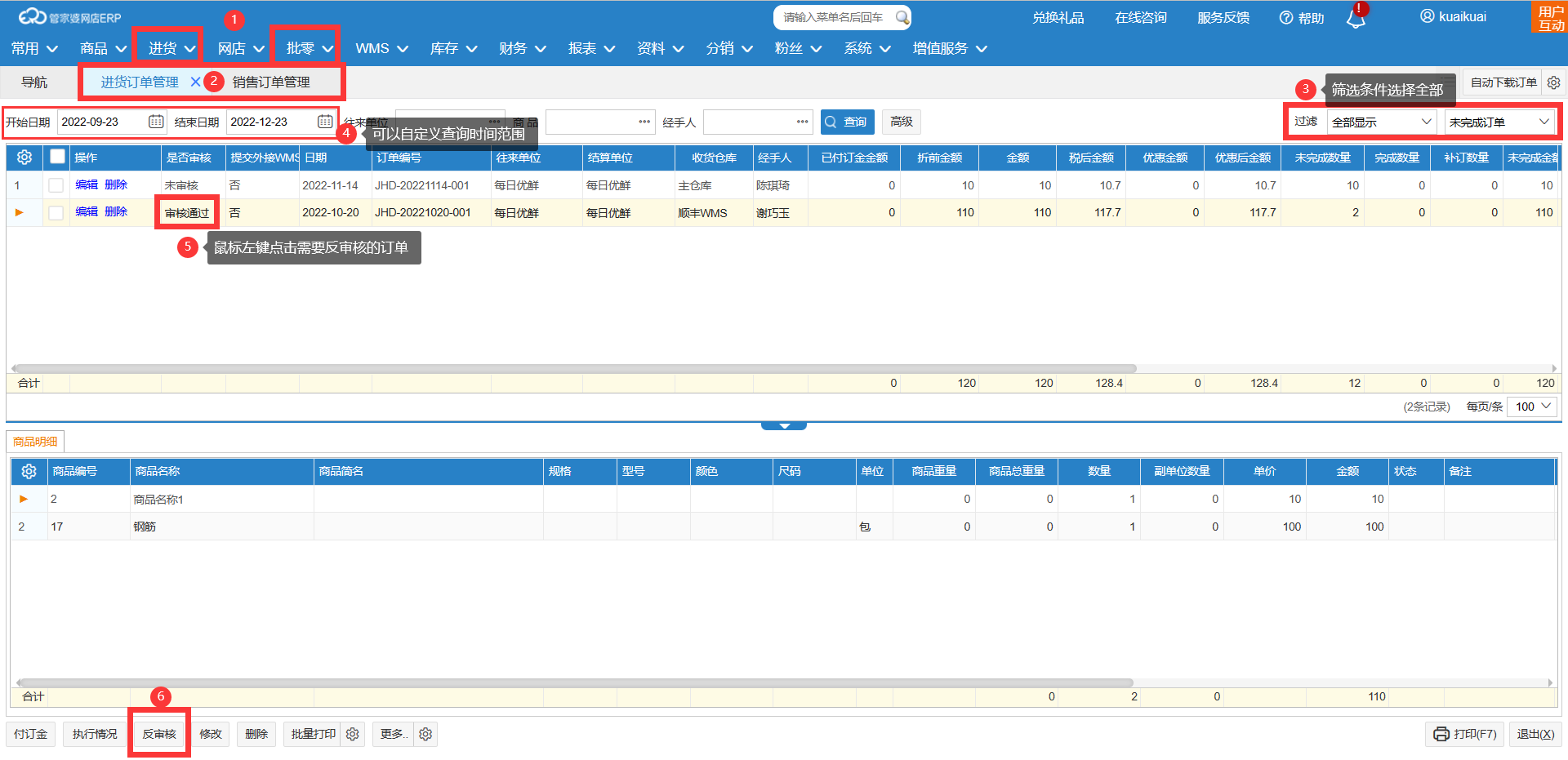 您好,在【进货】-【进货订单管理】/【销售】-【销售订单管理】页面,右上角的过滤条件选择全部去查询后,勾选需要反审核的订单,点击左下角【反审核】按钮即可反审核。
