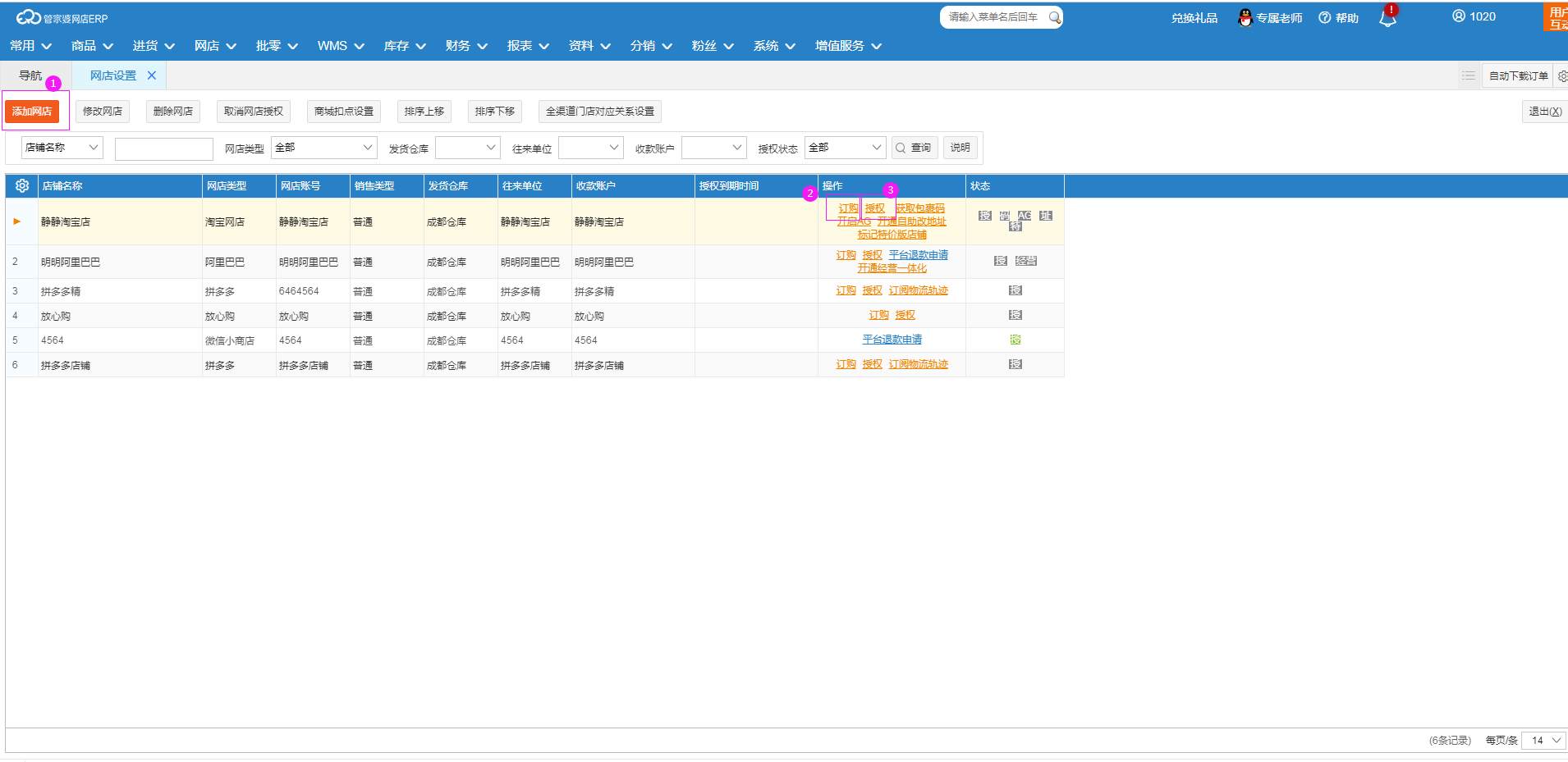 第一步:在【网店】-【网店设置】页面,点击需要授权店铺后面的【订购】按钮,